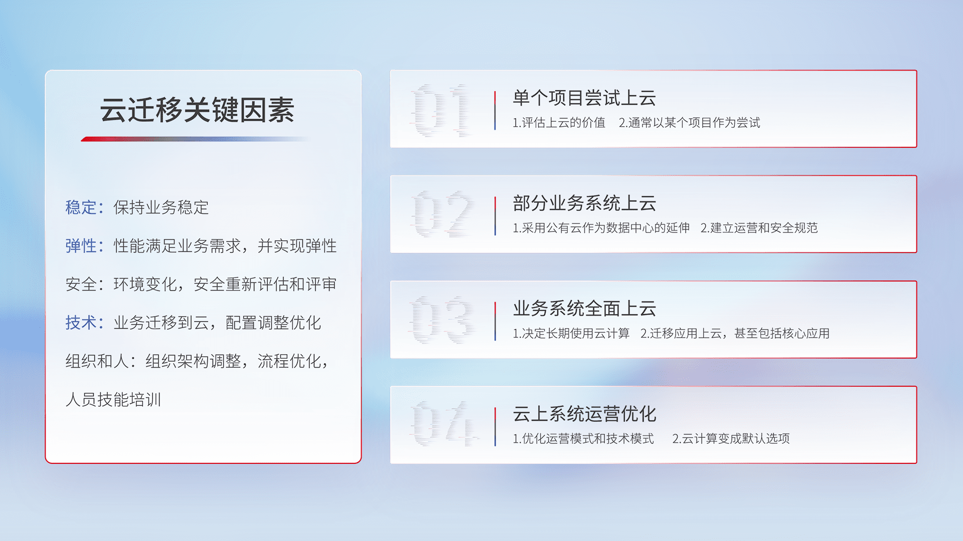 结合实际业务,,从规划设计、、、、云平台选型、、、、云原生改造、、、数据迁移、、、、集成交付,,迁移全过程为客户识别最佳上云路径,,,,做好风险识别管理,,,,设计网络架构、、、、身份权限、、、、安全审计合规、、、操作审计、、日志审计、、、监控告警策略、、、多站点容灾设计等,,对云上基础设施进行整体规划,,,,提升IT治理水平,,,以满足弹性、、、高可用、、高性能的需求。。。