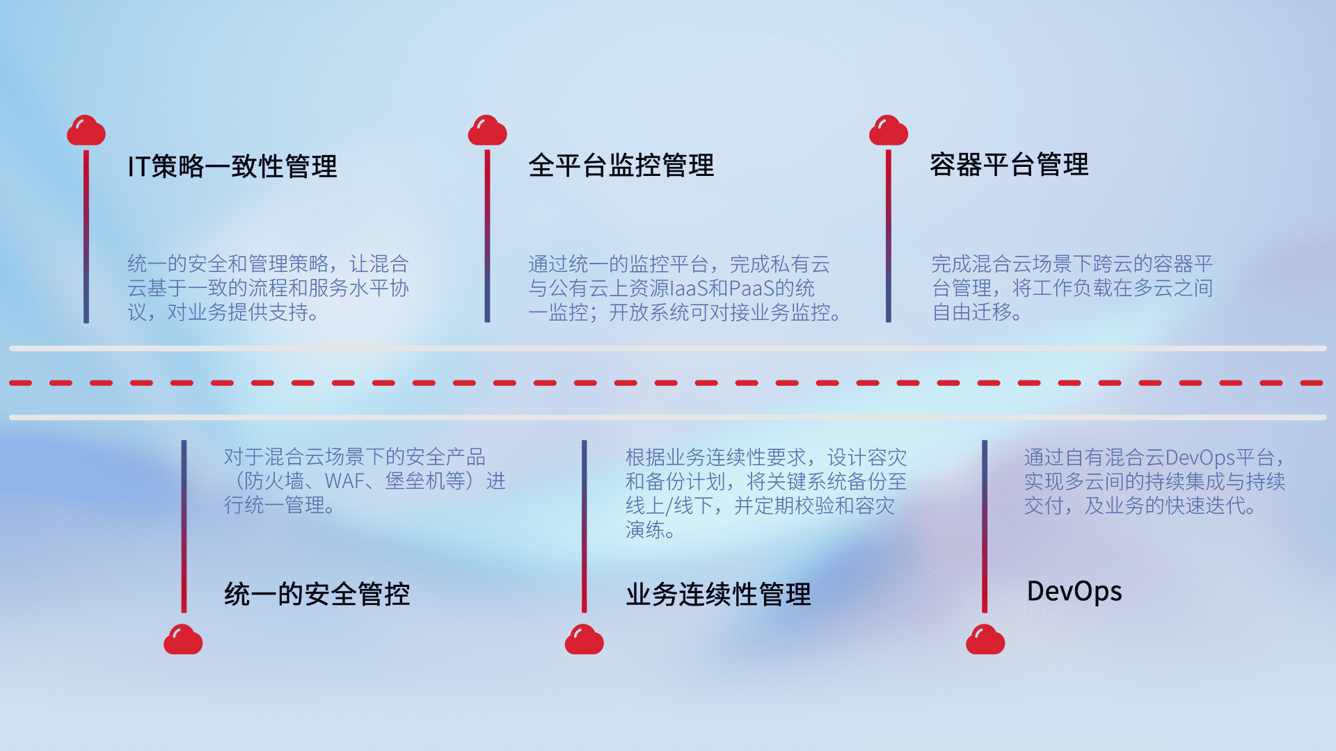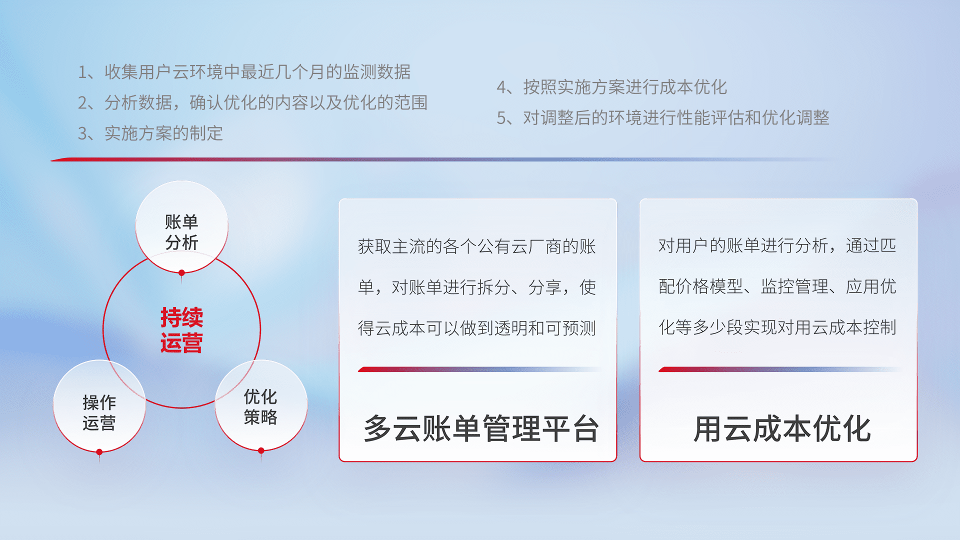 通过多云纳管,,,以统一的资源数据模型把客户的云资源进行抽象和封装,,,,进而实现对多云资源的统一操作,,,保障云资源管理的可靠性、、、稳定性与可用性。。。。量身定制化运维内容,,,,配置、、、、开发运维、、补丁管理、、、、备份、、、监控、、、、认证和访问管理、、审计和日常巡检等,,,,保障在用云过程中的可靠度,,,稳定度以及高可用率。。。。