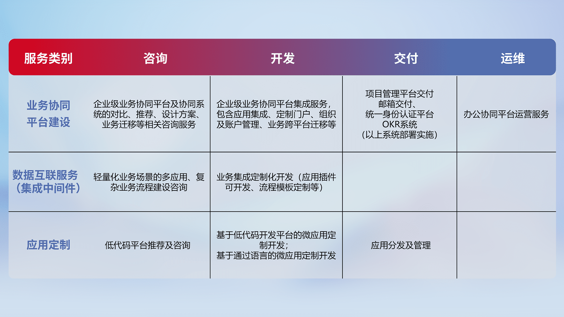针对钉钉、、企微、、、IDaas等平台级产品提供产品的规划、、、方案、、交付、、定制化开发等服务,,,实现如统一协同办公、、、智能客户服务、、、混合会议管理、、、、智能数据查询、、等业务场景,,,实现数字化转型。。。